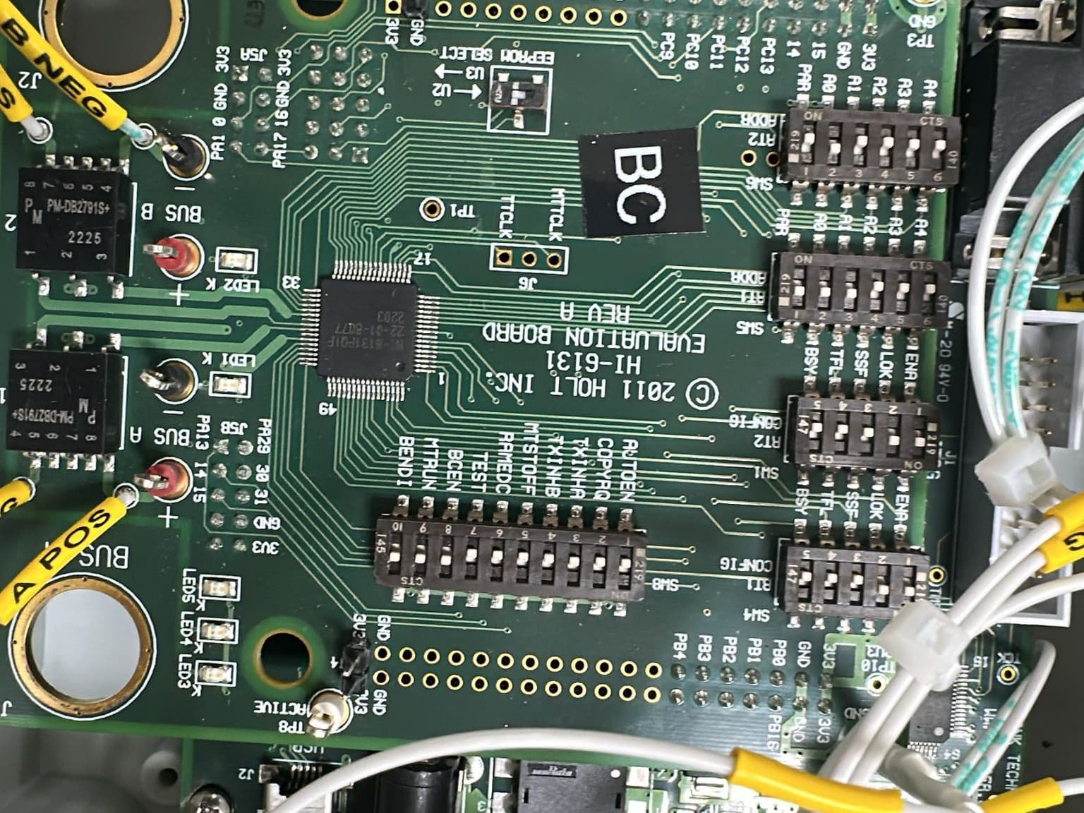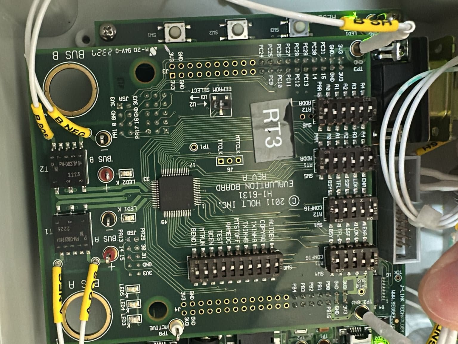 Isolated RS485 transceiver board with ESD protection for industrial data transmission.